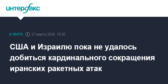Москва. 27 марта. INTERFAX.RU - США и Израиль все еще не смогли добиться основательного сокращения иранских ракетных атак, несмотря на предпринимаемые с начала военной операции значительные усилия, сообщает The Wall Street Journal, ссылаясь на мнение экспертов.