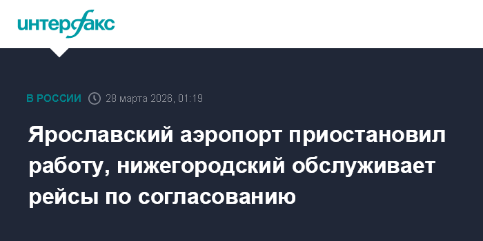 Москва. 28 марта. INTERFAX.RU - Ограничения на прием и выпуск самолетов введены в аэропорту Ярославля (Туношна), аэропорт Нижнего Новгорода обслуживает рейсы по согласовантию с соответствующими органами, сообщает Росавиация.