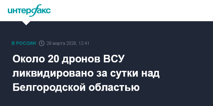 Москва. 28 марта. INTERFAX.RU - Губернатор Белгородской области Вячеслав Гладков сообщил об уничтожении 18 украинских БПЛА над регионом за минувшие сутки подразделениями "БАРС-Белгород" и "Орлан".