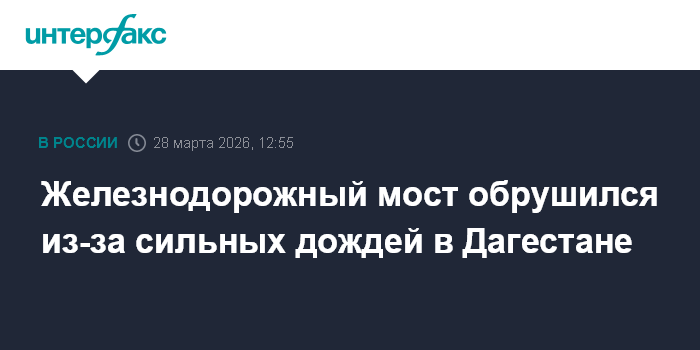 Москва. 28 марта. INTERFAX.RU - Обрушение железнодорожного моста произошло в Дагестана из-за сильных осадков, сообщил глава города Хасавюрт Корголи Корголиев в своем телеграм-канале в субботу.