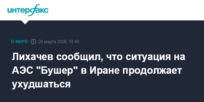 Москва. 28 марта. INTERFAX.RU - Ситуация на АЭС "Бушер" в Иране ухудшается из-за обстрелов, это создает угрозу ядерной безопасности, сообщил глава "Росатома" Алексей Лихачев.