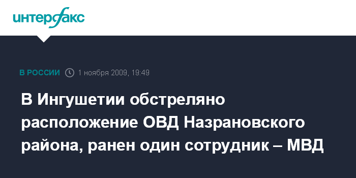 Назрань. 1 ноября. ИНТЕРФАКС-ЮГ - В селении Экажево Назрановского района Ингушетии обстреляно место временного расположения ОВД Назрановского района.