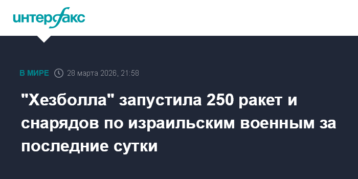 Москва. 28 марта. INTERFAX.RU - Бойцы движения "Хезболла" за последние сутки запустили около 250 снарядов и ракет из Ливана по израильским военнослужащим, сообщает в субботу Associated Press.