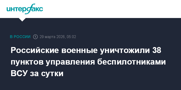 Москва. 29 марта. INTERFAX.RU - Российские военнослужащие за минувшие сутки уничтожили в зоне специальной военной операции 38 пунктов управления беспилотной авиацией и несколько станций спутниковой связи Starlink вооружённых сил Украины, сообщили в воскресенье официальные представители группировок "Север", "Восток" и Южная.