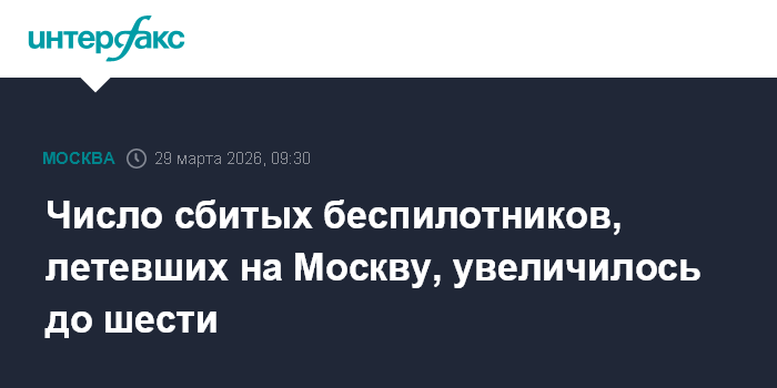 Москва. 29 марта. INTERFAX.RU - Мэр Москвы Сергей Собянин сообщил о еще одном сбитом БПЛА, летевшем в направлении столицы, общее количество уничтоженных за воскресенье беспилотников выросло до шести.