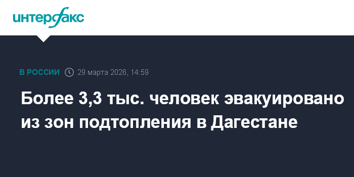 Москва. 29 марта. INTERFAX.RU - Более 3,3 тыс. человек эвакуировано из подтопленных районов в Дагестане, около 60 из них находятся в пунктах временного размещения, сообщает пресс-служба МЧС РФ в воскресенье.