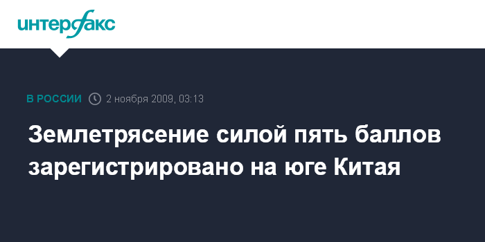 Пекин. 2 ноября. ИНТЕРФАКС-КИТАЙ - Землетрясение магнитудой пять баллов произошло утром в понедельник в южной китайской провинции Юньнань, сообщила китайская сейсмологическая служба.