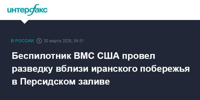 Москва. 30 марта. INTERFAX.RU - Дальний беспилотник радиоэлектронной разведки MQ-4C Triton ВМС США провел длительный полет над Персидским заливом вблизи иранского побережья, следует из данных авиационного ресурса Flightradar24.