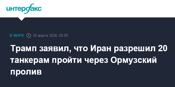 Москва. 30 марта. INTERFAX.RU - Президент США Дональд Трамп заявил, что число нефтяных танкеров, которым Иран разрешил пройти через Ормузский пролив, удвоилось и достигло 20.