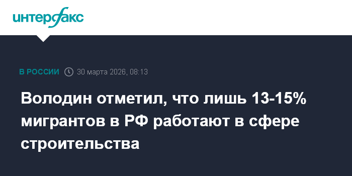 Москва. 30 марта. INTERFAX.RU - Председатель Госдумы Вячеслав Володин отметил, что лишь 13-15% иностранных граждан работают в сфере строительства в РФ.