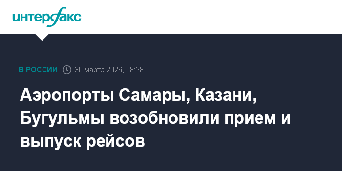Москва. 30 марта. INTERFAX.RU - Аэропорты Самары, Казани, Бугульмы возобновили работу после снятия вводившихся ранее ограничений, сообщает пресс-служба Росавиации в понедельник.