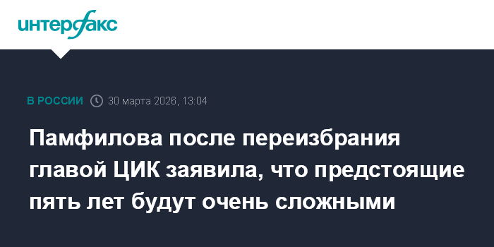 Москва. 30 марта. INTERFAX.RU - Элла Памфилова, которая единогласно переизбрана членами ЦИК РФ председателем комиссии до 2031 года, заявила, что предстоящий пятилетний срок "будет очень сложным".