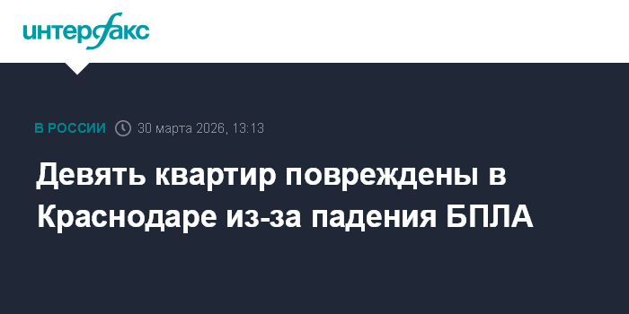 Москва. 30 марта. INTERFAX.RU - Комиссия с участием представителей Прикубанского округа Краснодара и управляющих компаний выявила девять поврежденных в результате падения БПЛА квартир, сообщил мэр города Евгений Наумов в понедельник.