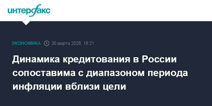 Москва. 30 марта. INTERFAX.RU - Динамика кредитования в России соответствует траектории, которая заложена в прогноз по инфляции на 2026 год, заявил "Интерфаксу" директор департамента денежно-кредитной политики Банка России Андрей Ганган.