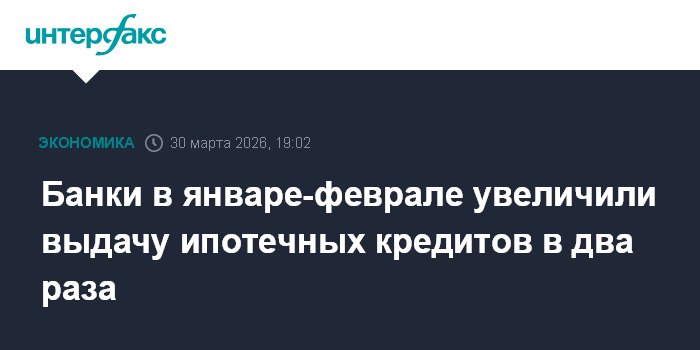 Москва. 30 марта. INTERFAX.RU - Российские банки в январе-феврале 2026 года предоставили физлицам ипотечные жилищные кредиты (ИЖК) на 715,1 млрд рублей, что в 2 раза больше, чем годом ранее (354 млрд рублей), сказано на сайте Банка России.