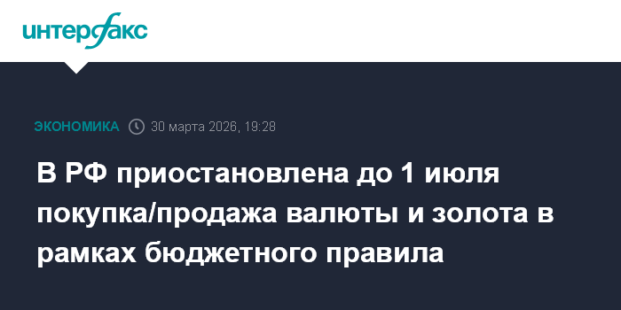 Москва. 30 марта. INTERFAX.RU - Проведение операций по покупке/продаже иностранной валюты и золота на внутреннем валютном рынке в рамках бюджетного правила приостановлено до 1 июля 2026 года. Соответствующее постановление подписал 27 марта премьер-министр РФ Михаил Мишустин.