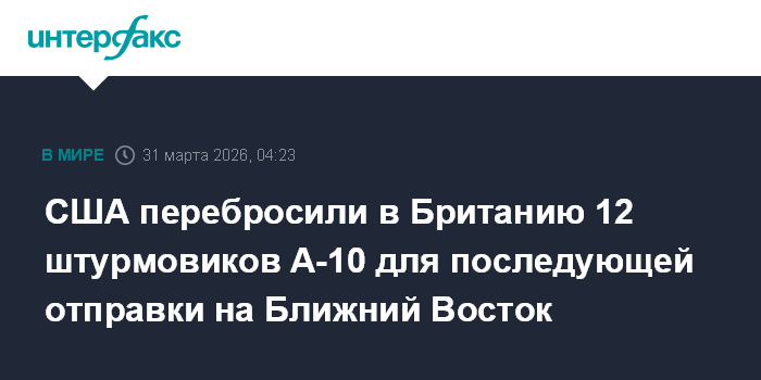 Москва. 31 марта. INTERFAX.RU - Пентагон перебросил на авиабазу Лейкенхит в Великобритании эскадрилью из 12 штурмовиков A-10 Thunderbolt II для последующей их отправки на Ближний Восток, следует из данных авиационного ресурса Military Air Tracking Alliance (MATA).