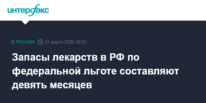 Москва. 31 марта. INTERFAX.RU - Товарные запасы лекарств по регионам России по федеральной льготе составляют девять месяцев, по региональной льготе - пять месяцев, препараты стабильно производятся и поставляются на рынок, сообщили в Росздравнадзоре.