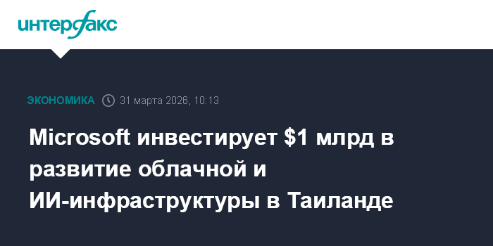 Москва. 31 марта. INTERFAX.RU - Microsoft Corp. планирует инвестировать более $1 млрд в развитие облачной и ИИ-инфраструктуры в Таиланде в 2026-2028 годах, сообщила корпорация после встречи президента Microsoft Брэда Смита с премьер-министром Таиланда Анутином Чанвиракулом в Бангкоке.