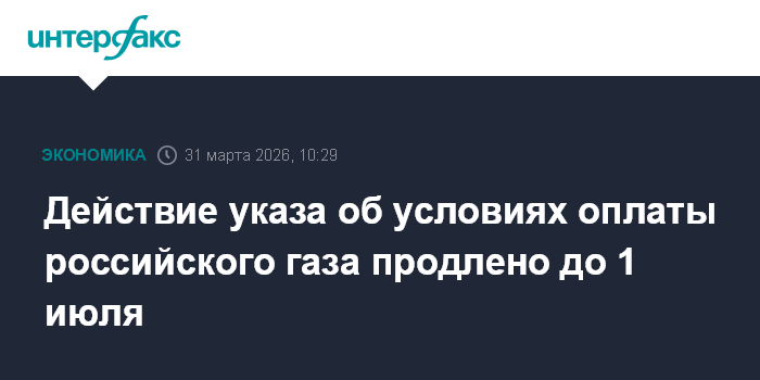 Москва. 31 марта. INTERFAX.RU - Действие указа об условиях оплаты за российский газ продлено еще на один квартал - до 1 июля 2026 года.