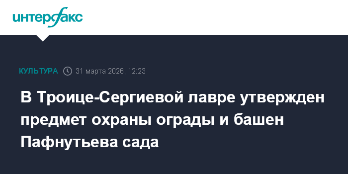 Москва. 31 марта. INTERFAX.RU - Главное управление культурного наследия Московской области утвердило предмет охраны объекта культурного наследия регионального значения "Ограда с башнями и воротами Пафнутьева сада Троице-Сергиевой лавры, архитектор Латков, 1893-1898 годы" в Сергиевом Посаде.