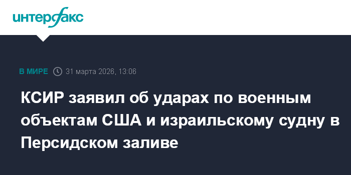 Москва. 31 марта. INTERFAX.RU - Корпус стражей Исламской революции (КСИР) заявил об атаках на израильское судно и американские военные объекты в регионе Персидского залива, сообщает "Аль-Джазира".