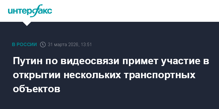Москва. 31 марта. INTERFAX.RU - Президент РФ Владимир Путин во вторник в формате видеоконференции примет участие в церемонии открытия ряда объектов транспортной отрасли, сообщил его пресс-секретарь Дмитрий Песков.