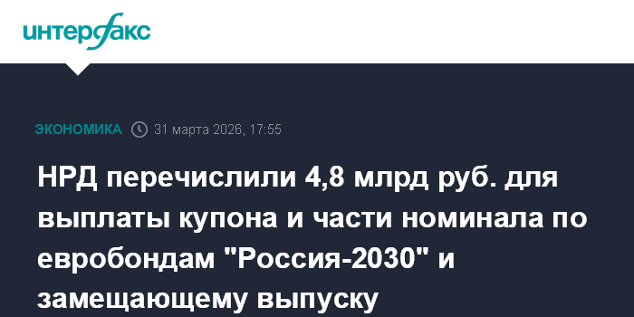 НРД перечислили 4,8 млрд руб. для выплаты купона и части номинала по евробондам "Россия-2030" и замещающему выпуску