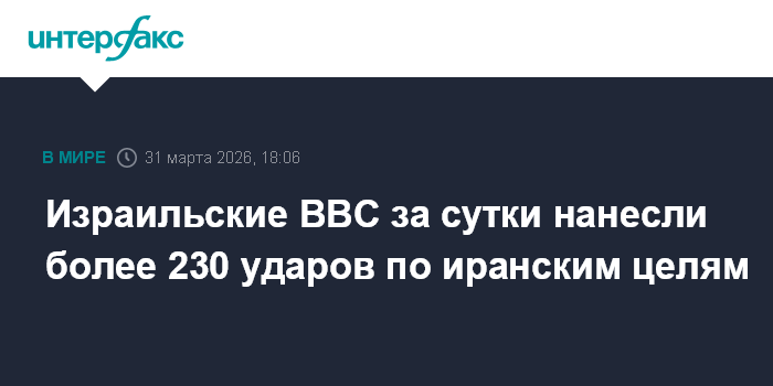Москва. 31 марта. INTERFAX.RU - Самолеты израильских ВВС за сутки нанесли свыше 230 ударов по военным объектам на территории Ирана, сообщила Армия обороны Израиля (ЦАХАЛ).