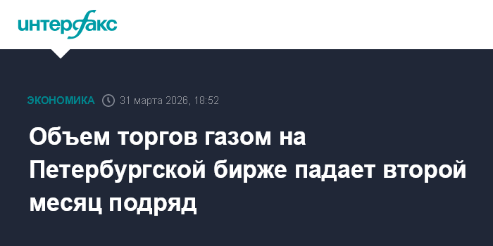 Москва. 31 марта. INTERFAX.RU - Объем торгов газом на Санкт-Петербургской международной товарно-сырьевой бирже в марте 2026 года составил 1,071 млрд куб. м, что на 24% меньше, чем за тот же месяц прошлого года (1,407 млрд куб. м), свидетельствуют данные площадки.