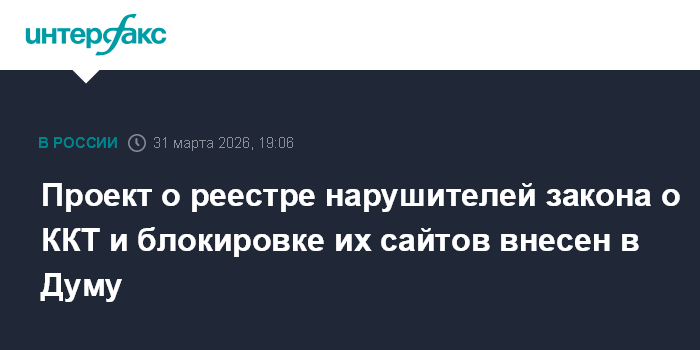 Москва. 31 марта. INTERFAX.RU - Правительство внесло в Госдуму законопроект, предусматривающий создание реестра систематических нарушителей законодательства о применении контрольно-кассовой техники (ККТ) с последующей блокировкой их сайтов, также ужесточается контроль за применением ККТ арендаторами в средних и крупных торговых центрах.