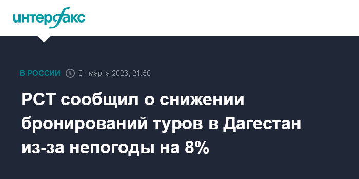 Москва. 31 марта. INTERFAX.RU - Продажи туров в Дагестан на ближайшие даты снизились из-за неблагоприятных погодных условий не более, чем на 8%, туроператоры прогнозируют быстрое восстановление спроса, сообщили "Интерфаксу" в Российском союзе туриндустрии (РСТ).