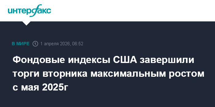 Москва. 1 апреля. INTERFAX.RU - Американские фондовые индексы завершили торги во вторник самым сильным однодневным процентным ростом с мая 2025 года.