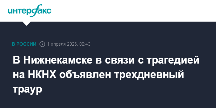 Москва. 1 апреля. INTERFAX.RU - Мэр Нижнекамска Радмир Беляев объявил трехдневный траур в Нижнекамском муниципальном районе в связи с аварией и гибелью людей на "Нижнекамскнефтехиме" (НКНХ, входит в "СИБУР").
