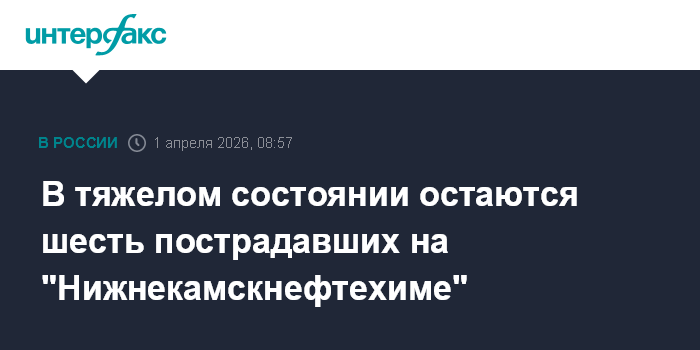 Москва. 1 апреля. INTERFAX.RU - Шестеро пострадавших в результате происшествия на "Нижнекамскнефтехиме" в Татарстане находятся в тяжелом состоянии; остальные - в состоянии средней степени тяжести, сообщил журналистам помощник главы федерального Минздрава Алексей Кузнецов.
