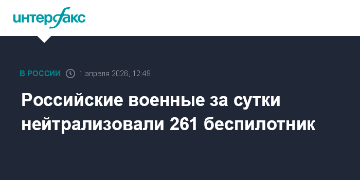 Москва. 1 апреля. INTERFAX.RU - Российские военные уничтожили за сутки 261 беспилотник, сообщило Минобороны.