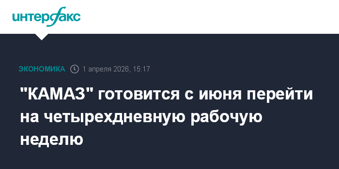 Москва. 1 апреля. INTERFAX.RU - ПАО "КАМАЗ" готовится перейти на режим сокращенной четырехдневной рабочей недели с 1 июня и корректирует производственный план на фоне падение грузового авторынка, сообщили "Интерфаксу" в пресс-службе группы.