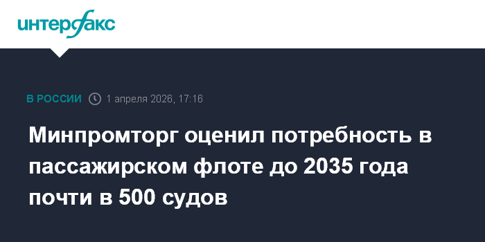 Москва. 1 апреля. INTERFAX.RU - Потребность в строительстве пассажирских судов в РФ до 2035 года оценивается в 484 единицы. Об этом сообщается в презентации министра промышленности и торговли Антона Алиханова, представленной в ходе международного транспортно-логистического форума в Санкт-Петербурге.