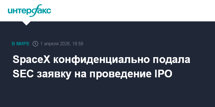 Москва. 1 апреля. INTERFAX.RU - Аэрокосмическая компания Илона Маска SpaceX конфиденциально направила Комиссии по ценным бумагам и биржам (SEC) заявку на проведение IPO, сообщает агентство Bloomberg со ссылкой на источники.