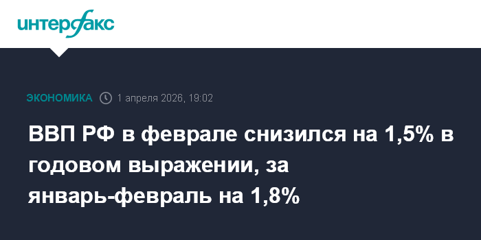 Москва. 1 апреля. INTERFAX.RU - Снижение ВВП РФ в феврале 2026 года, по оценке Минэкономразвития, составило 1,5% в годовом сравнении после сокращения на 2,1% в январе, говорится в опубликованном в среду обзоре министерства "О текущей ситуации в экономике".