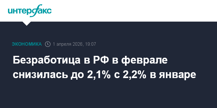 Москва. 1 апреля. INTERFAX.RU - Безработица в России в феврале 2026 года вновь опустилась до 2,1%, что соответствует минимальному уровню за всю историю наблюдения показателя с 1991 года, следует из сообщения Росстата.