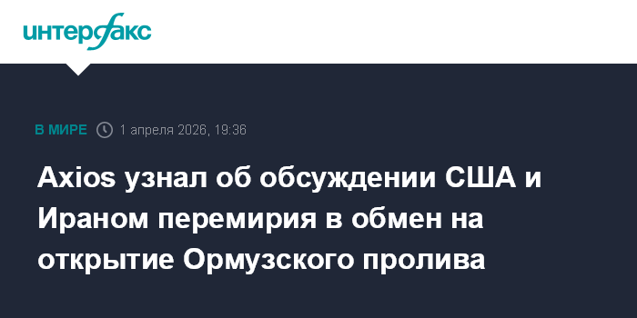 Москва. 1 апреля. INTERFAX.RU - Представители США и Ирана обсуждают соглашение, которое будет включать согласие Вашингтона на прекращение огня в ответ на открытие Тегераном Ормузского пролива, сообщает в среду Axios со ссылкой на источники.