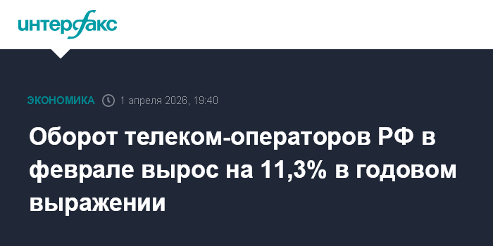 Москва. 1 апреля. INTERFAX.RU - Оборот организаций, работающих в сфере телекоммуникаций, в феврале 2026 года увеличился на 11,3% по сравнению с февралем 2025 года, сообщил Росстат.