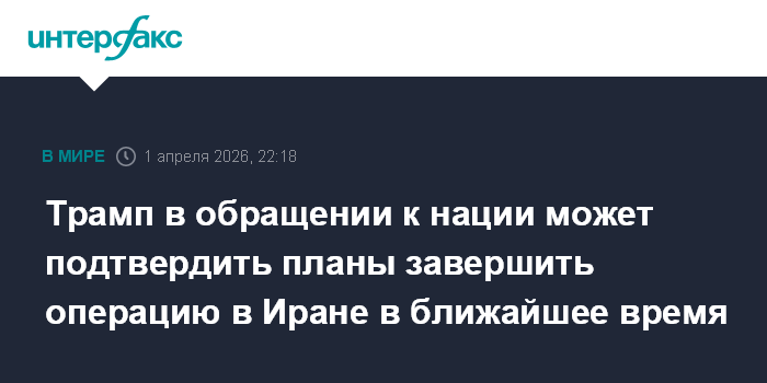 Москва. 1 апреля. INTERFAX.RU - Президент США Дональд Трамп в обращении повторит намерение завершить военную операцию США в Иране в ближайшие две или три недели, сообщают в среду американские СМИ со ссылкой на источники в Белом доме.