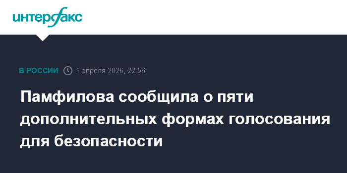 "Для проведения голосования в условиях режима повышенной готовности, чрезвычайной ситуации или военного положения мы предусмотрели, очень быстро развиваем, помимо четырех основных, еще пять дополнительных форм голосования. В первую очередь это делается в целях безопасности, в целях безопасности и удобства наших избирателей", - рассказала Памфилова на встрече президента РФ Владимира Путина с членами Избирательной комиссии России.