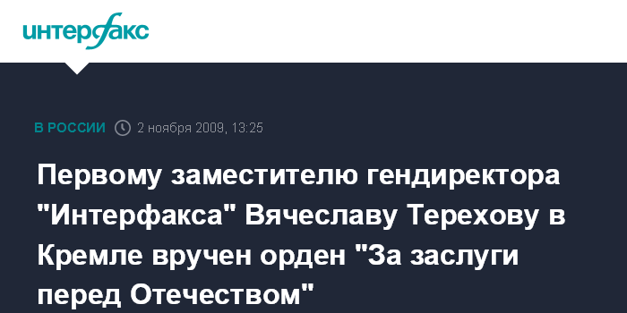 Первому заместителю гендиректора "Интерфакса" Вячеславу Терехову в Кремле вручен орден "За заслуги перед Отечеством"
