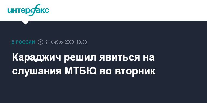 Вашингтон. 2 ноября. INTERFAX.RU - Бывший лидер боснийских сербов Радован Караджич, обвиняемый в геноциде и других тяжких преступлениях, во вторник будет присутствовать на заседании Международного трибунала по бывшей Югославии (МТБЮ), говорится в сообщении, размещенном на сайте газеты New York Timew.