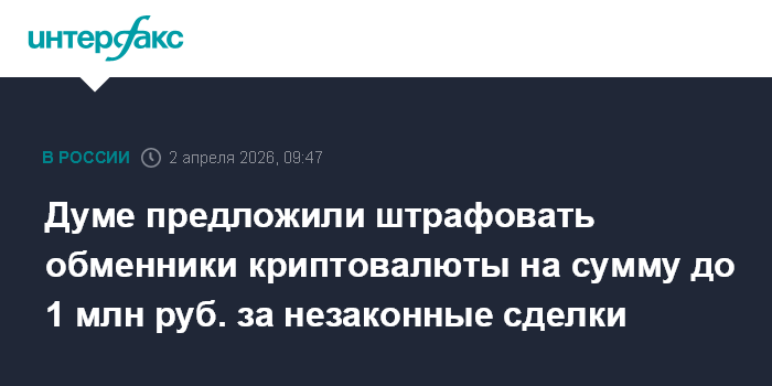 Москва. 2 апреля. INTERFAX.RU - Криптовалютным обменникам, совершающим сделки с неквалифицированными инвесторами с нарушением установленных ограничений, будет грозить штраф до 1 млн руб., следует из поправок в КоАП, внесенных в Госдуму в составе пакета законов о регулировании криптовалют.