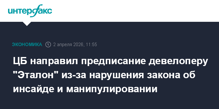 Москва. 2 апреля. INTERFAX.RU - Банк России направил предписание МКПАО "Эталон Груп" (группа "Эталон") в связи с нарушением закона о противодействии неправомерному использованию инсайдерской информации и манипулированию рынком (№224-ФЗ) о недопущении аналогичных нарушений в дальнейшем.