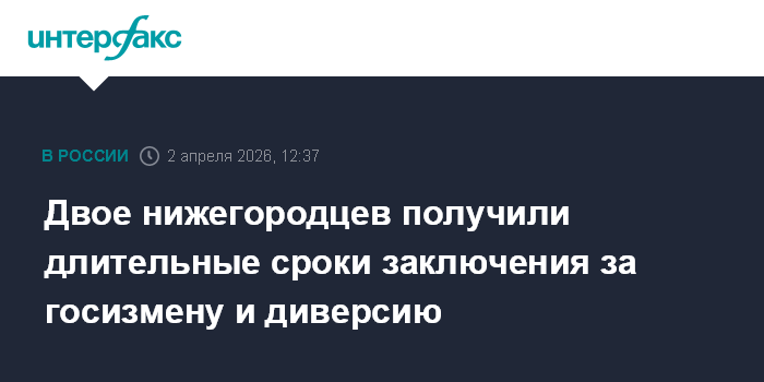Москва. 2 апреля. INTERFAX.RU - Нижегородский областной суд вынес приговор двум местным жителям, обвиняемым в государственной измене, диверсии и отмывании денежных средств, сообщает объединенная пресс-служба судов общей юрисдикции Нижегородской области в четверг.
